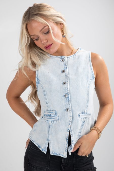 $413.00Strike a pose and watch the compliments come to you in the Picture Perfect Light Wash Denim Vest! Featuring a classic button-front design and pointed collar, this sleeveless piece is finished with an all-over acid wash for that perfectly worn-in, retro vibe. The light wash denim pairs effortlessly with everything…